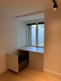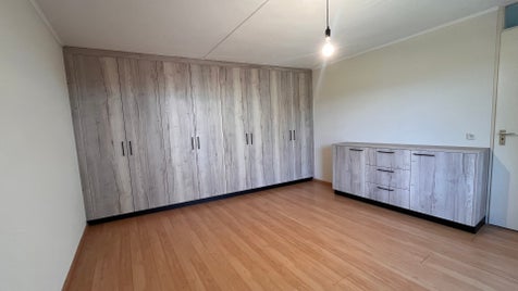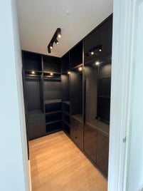 Tweekleurige garderobekast aangesloten aan notenhout wandpanelen